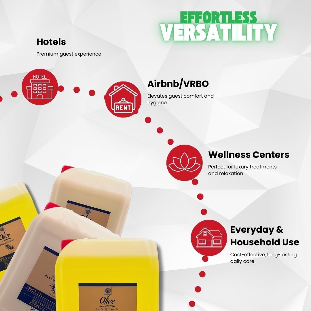 Experience the richness of Turkish craftsmanship with our premium Olive Care Set, featuring shampoo, conditioner, liquid soap, and shower gel in an impressive 5.2-gallon volume.