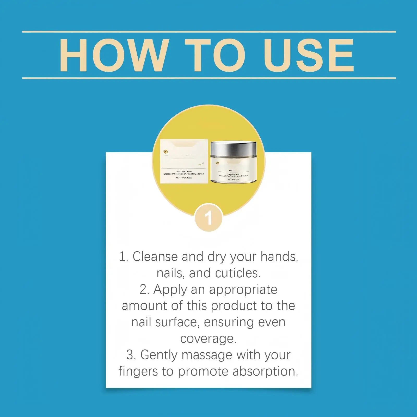 Clean hands and nails thoroughly and dry with a soft towel. Apply a small amount of cream to each nail and surrounding cuticle area. Gently massage in circular motions until fully absorbed. Use regularly as part of daily nail care.