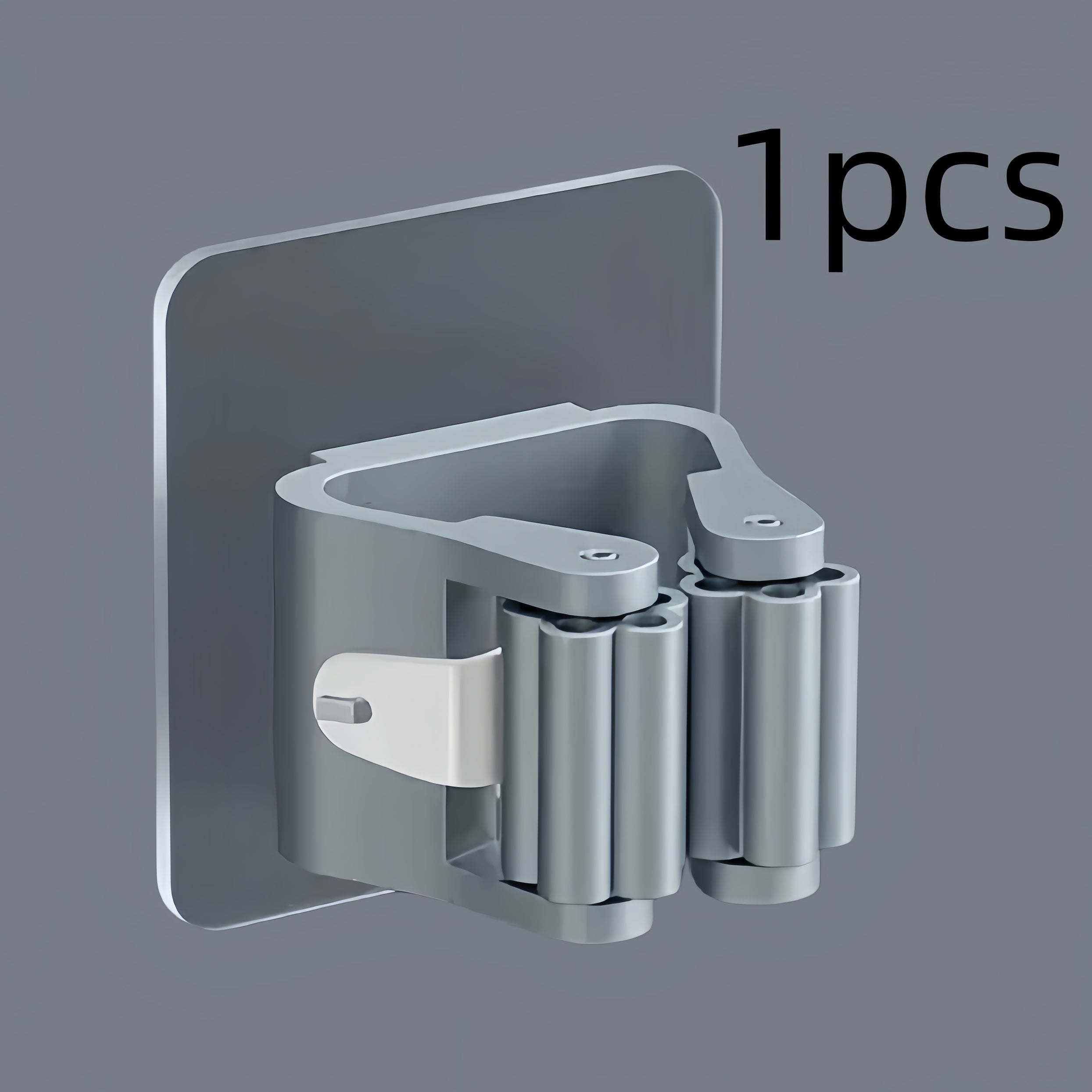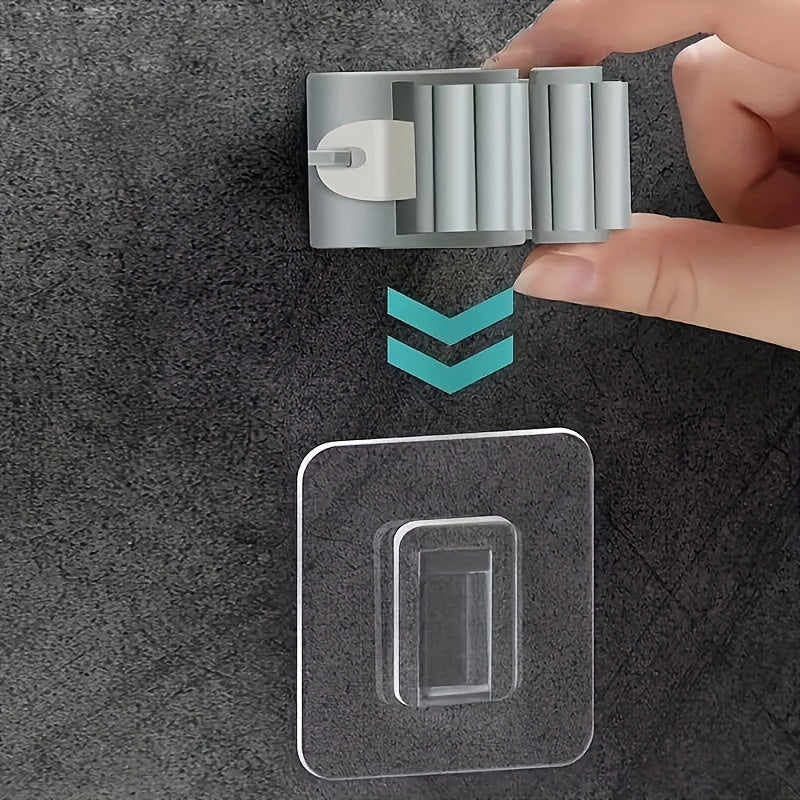 This wall-mounted mop holder is designed to organize cleaning tools such as mops, brooms, and brushes. The adhesive mounting system allows installation without drilling, helping keep cleaning tools neatly stored and easily accessible.
