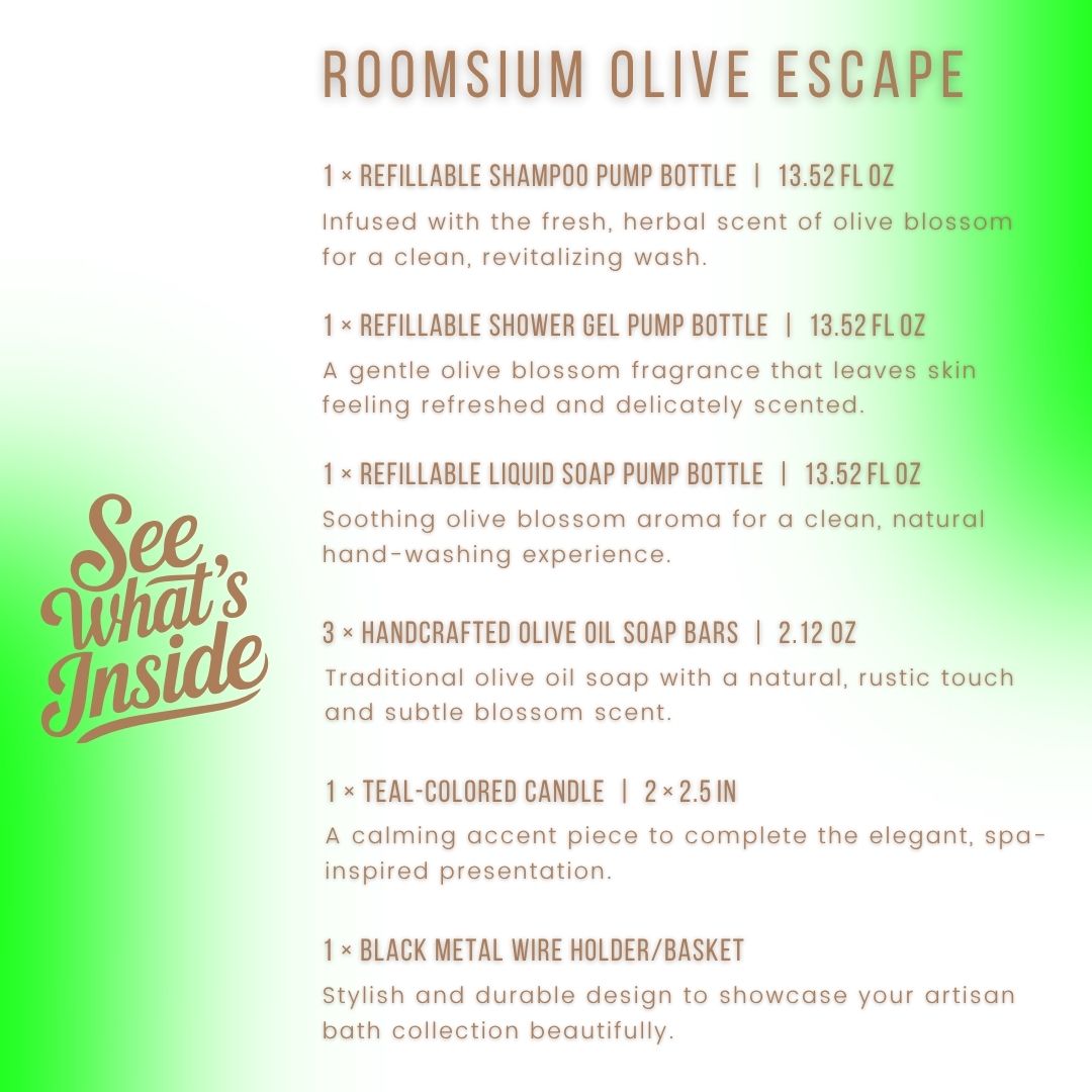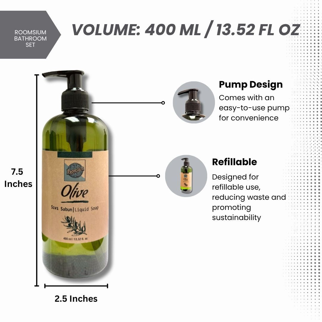 - Refillable Shampoo, Shower Gel, and Liquid Soap (13.52 fl oz each, Olive Blossom Scent)