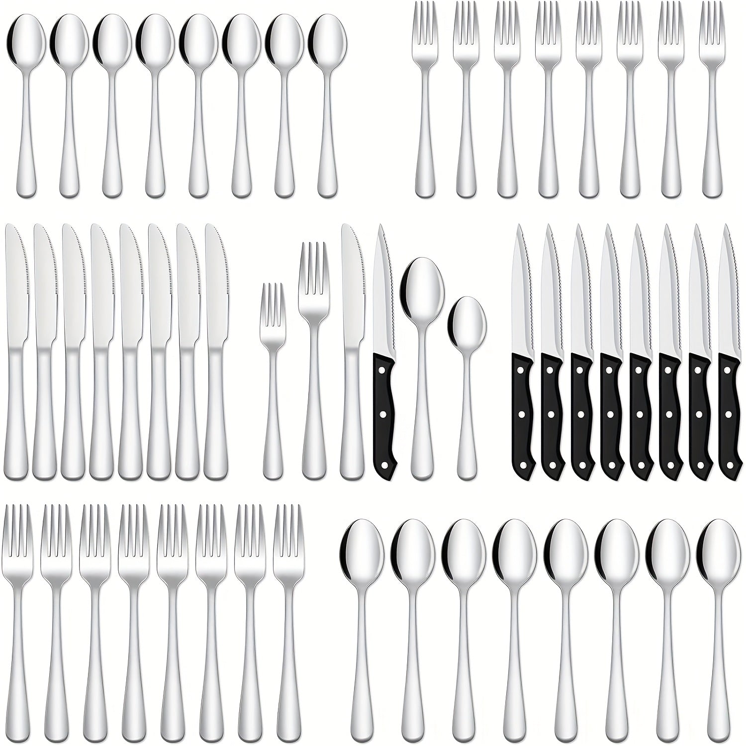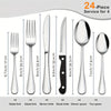 Available in 24-piece (service for 4) or 48-piece (service for 8) options, including dinner forks, salad forks, knives, spoons, and steak knives — everything you need for a complete table setting.