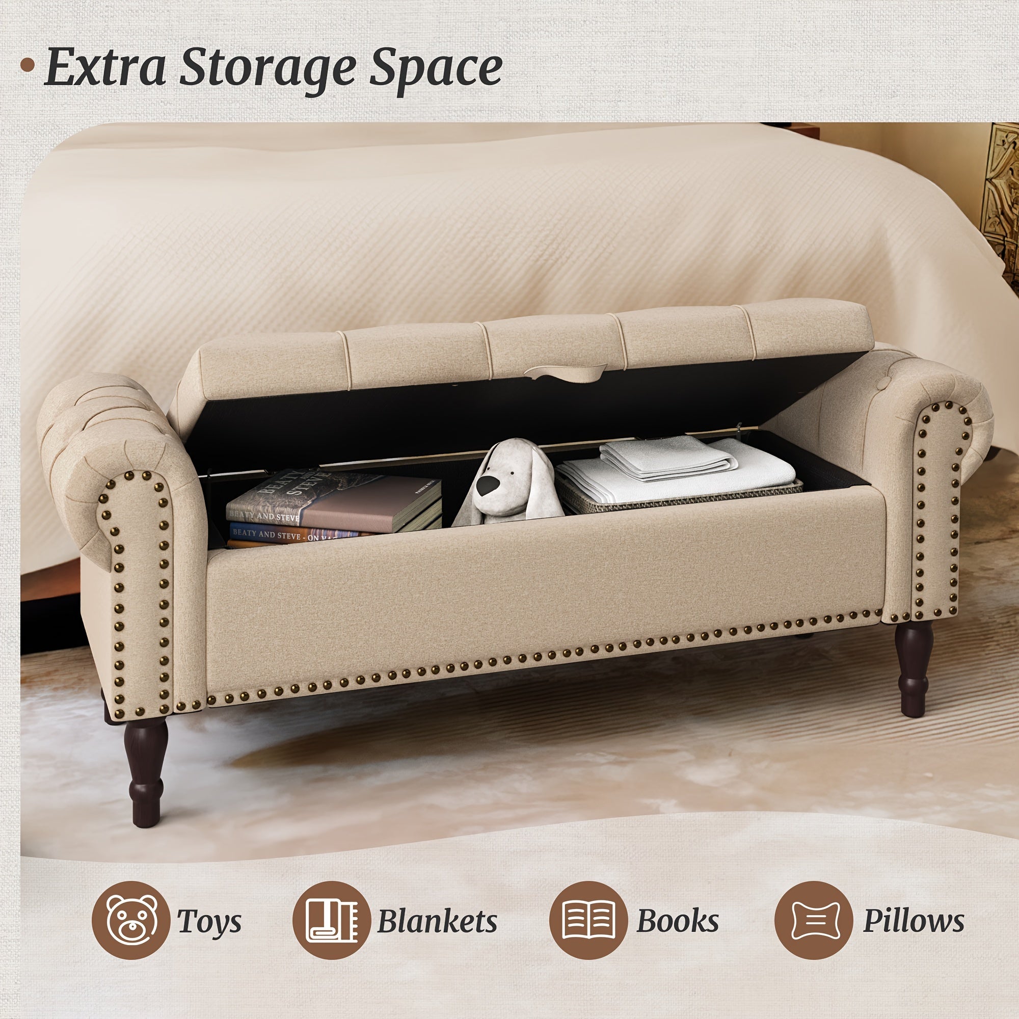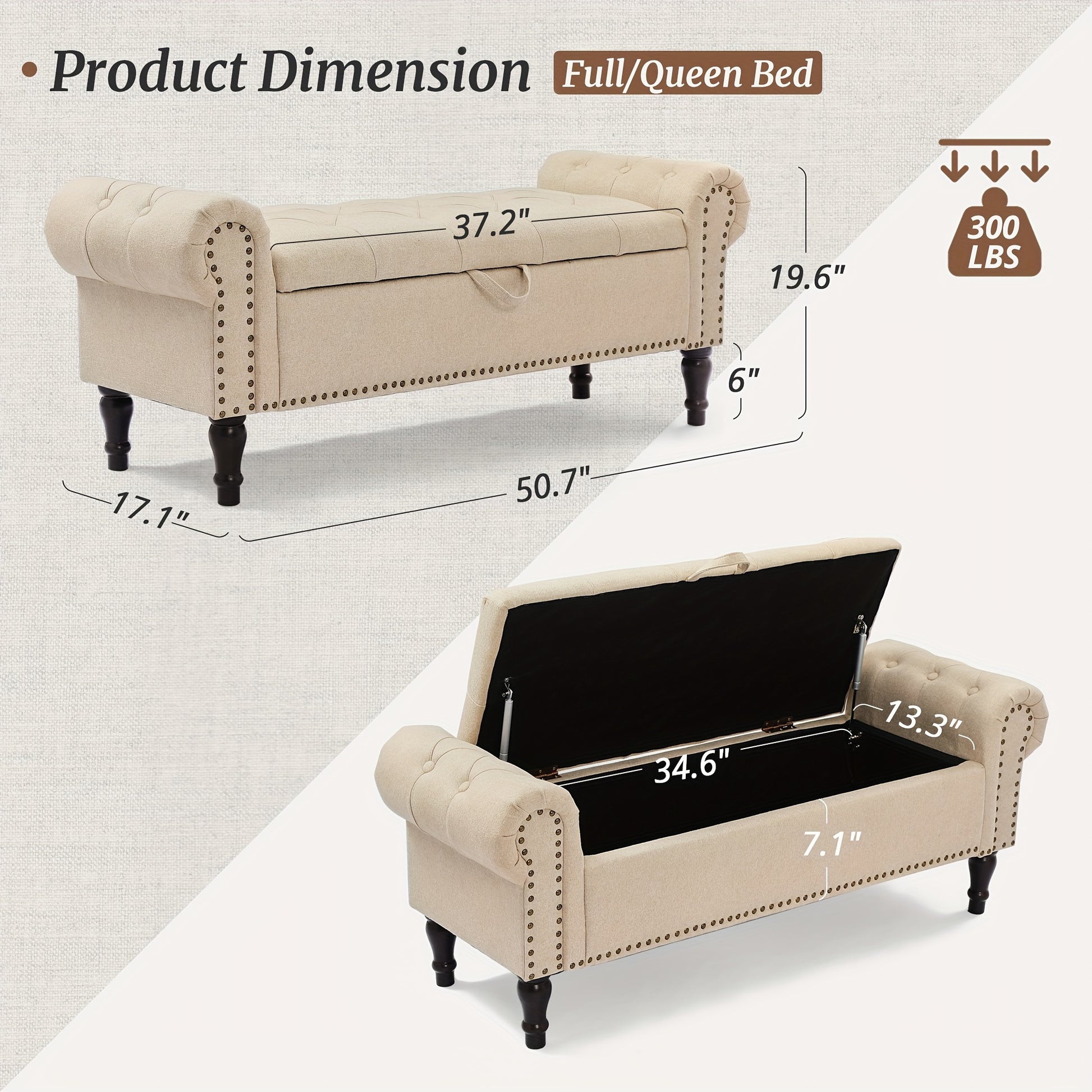 Elevate your home with this king-size linen storage bench ottoman, designed for both sophistication and practicality. Featuring a flip-top compartment, button-tufted seat, and elegant nailhead trim, this versatile bench is perfect for the foot of the bed, the living room, or the entryway. A blend of comfort, craftsmanship, and hidden storage β created to make every detail memorable.