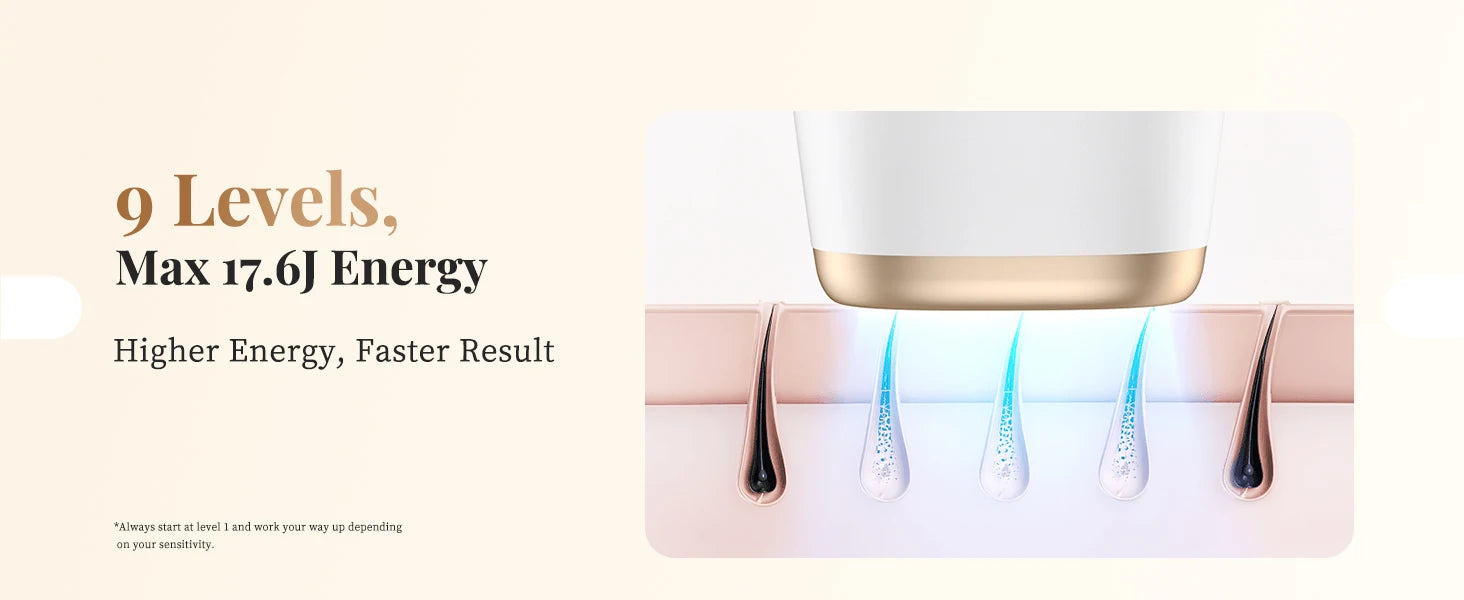 - 9 Adjustable Energy Levels: Allows gradual adjustment based on skin sensitivity.