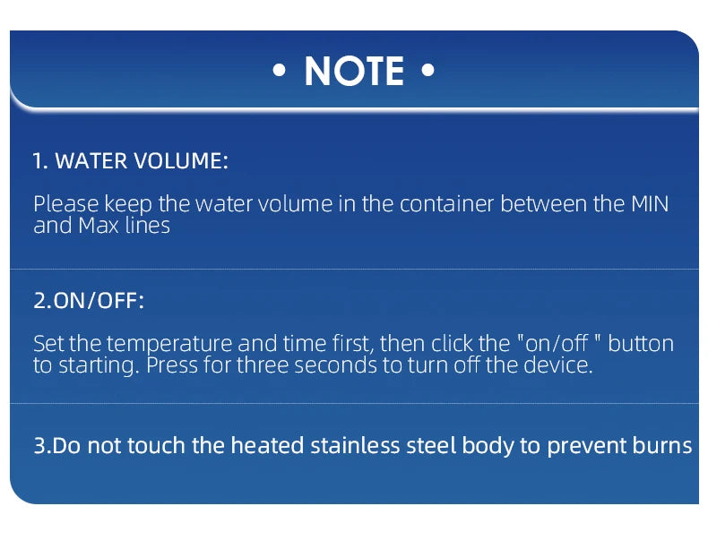 3.Don't touch the heated stainless steel body to prevent burns.
